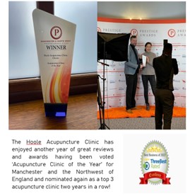 We are delighted to be voted as 'Acupuncture Clinic of the Year' again.. for the whole of the North West and to recieve such a fantastic award for a second year in a row... Many thanks to all who supported us and your wonderful reviews! We also pleased to retain our best rated spot in our local reviews.